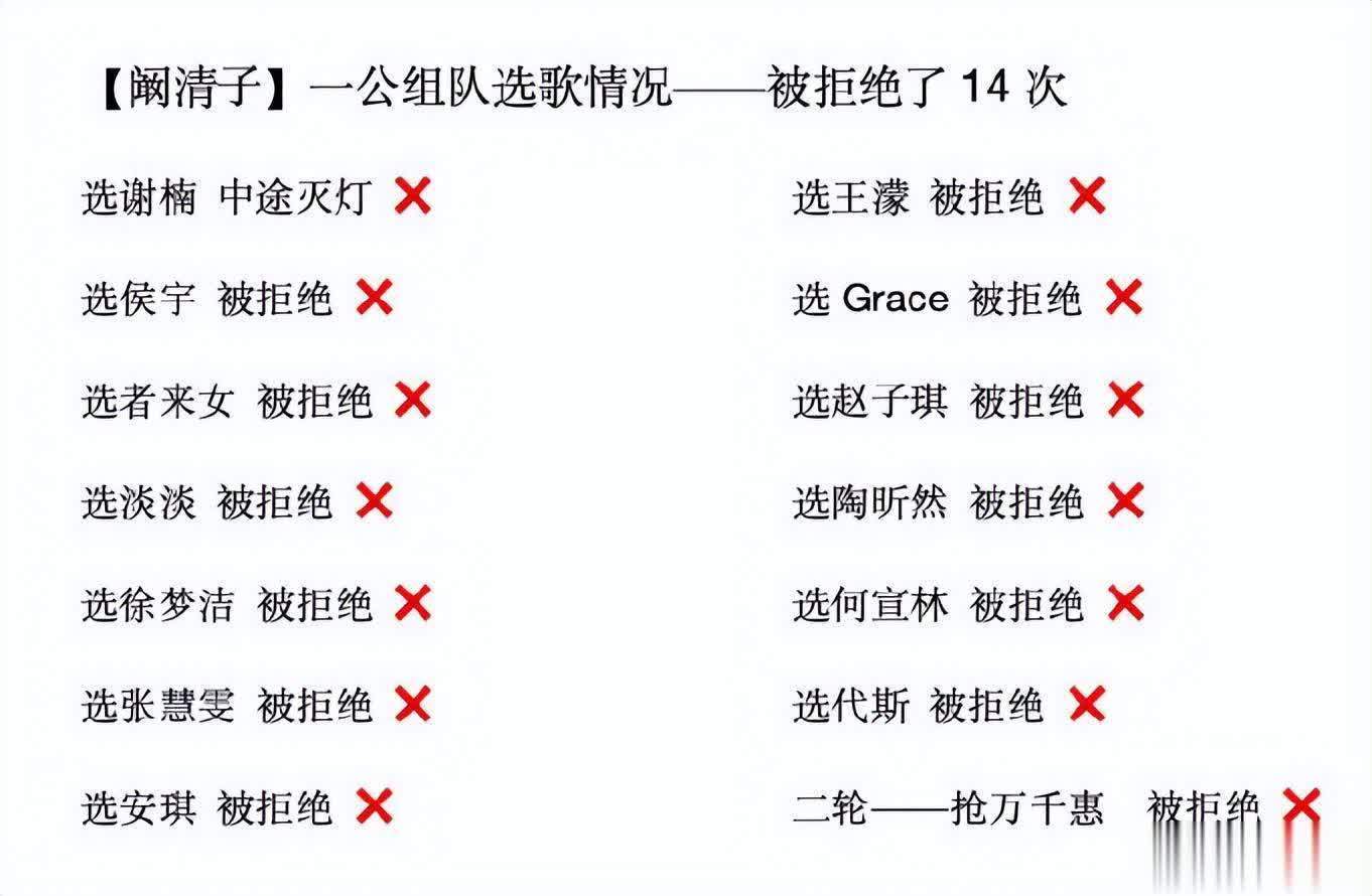 在一公分组选人环节,李小冉、曾沛慈等队长被疯抢时,身为队长的阚清子却一路遇冷。据不完全统计,阚清子组队过程被拒绝了14次,包括王濛、侯宇、徐梦洁、张慧文、安崎等姐姐都拒绝了她。