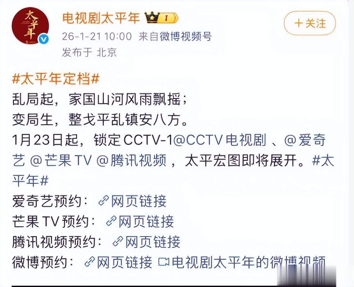 就在今天,央视正式官宣,重大历史题材剧《太平年》定档1月23日晚黄金档,登陆央视一套,爱奇艺、芒果TV、腾讯视频三网同步联播。