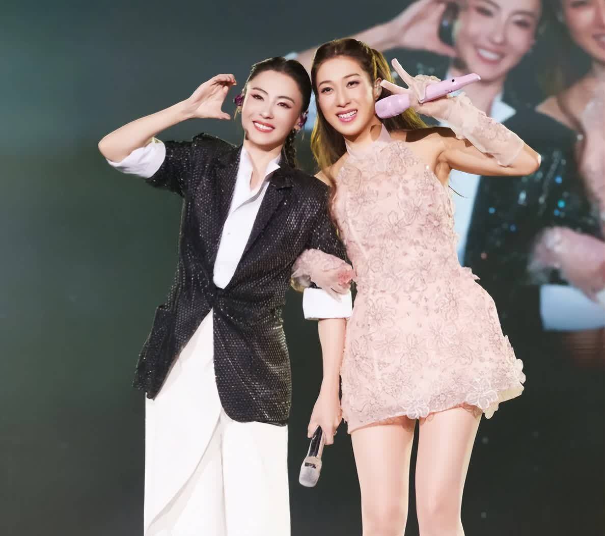 娱乐圈中,钟嘉欣也有不少好友,张柏芝便是其中之一。张柏芝现身钟嘉欣演唱会,身着黑色西装套装,在舞台上歌唱,状态极佳。她与观众热情互动,留下多张精彩瞬间。张柏芝舞台表演魅力十足,状态超棒,与观众打招呼,还和钟嘉欣留下贴贴合照,对镜比耶。